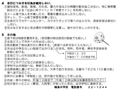 夏休みの生活について 1学期も今日で終了し、これから長い夏休みに入ります。 これまで1日の大半を学校で過ごしていた子どもたちを、しばらくご家庭にお返 しすることになります。日々の家庭生活の中で、子どもたちが学校とは違った開放夏休みの生活について いよいよ夏休みです。今年も、家族や友達、地域の 人たちとの楽しい思い出をいっぱいつくってくださ い。充実した楽しい夏休みにする ために、次のことに注意しましょう。 ①夏休み中の帰宅時刻は、午後5時です。友達にも声について 2.生活について (1)生活設計 (2)地域学校での生活 (3)外出 ☆夏休みの生活の計画表を作り、規則正しい生活をしよう。 ☆学校のきまりや、生徒会で決めたことがらを実行しよう。 ☆地域の行事やボランティア活動に積極的に参加しよう。 ☆いつ、どこでも福部中学校の生徒と